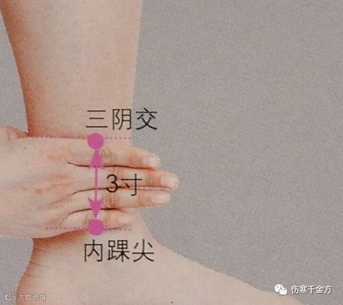 三阴交穴位置:在内踝尖直上三寸,胫骨后缘。
