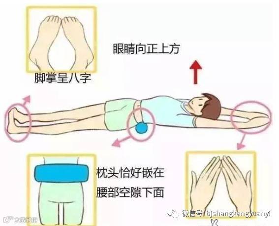 步骤1,把枕头垫在腰后,平躺在床上,调整枕头位置,让腿部和背部紧贴床面,枕头恰好填满腰下空间。