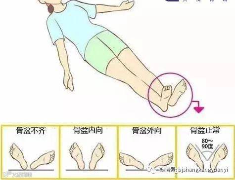 脚掌呈80度~90度则是正常!小脚趾距离床面越近,脚掌开合度越大则可能是骨盆外向。大脚趾的位置越接近正上方,脚掌开合度越小则可能是骨盆内向。但是,如果左右开合不对称的则可能是骨盆不正了。