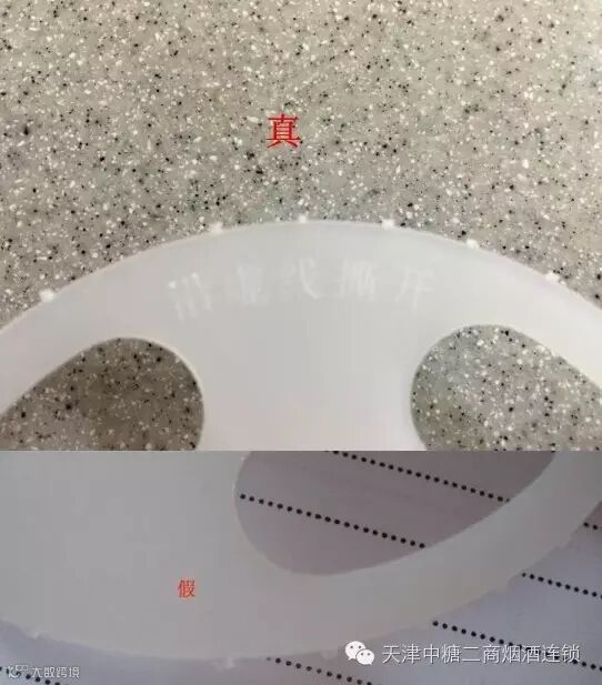 第四,看防伪标,参照盒盖防伪标识说明卡。这里说一点,就是防伪标识左右的类似钞票的花纹,真品对光此处五彩斑斓,光点,而且有纹路气孔,颜色偏绿,而仿品有五彩光点效果,不够没有真品好,,颜色暗浑,无纹路感觉。真品刮开防伪码清晰。