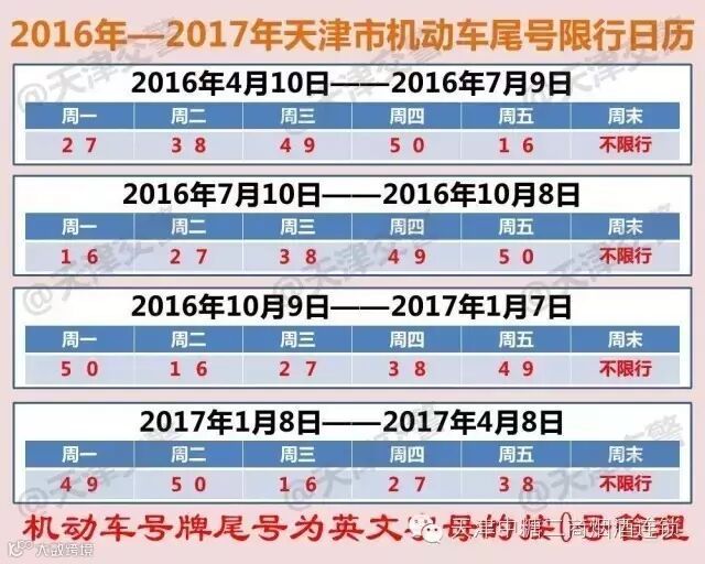 2016年7月11号-10月8日天津市机动车尾号最新限行。