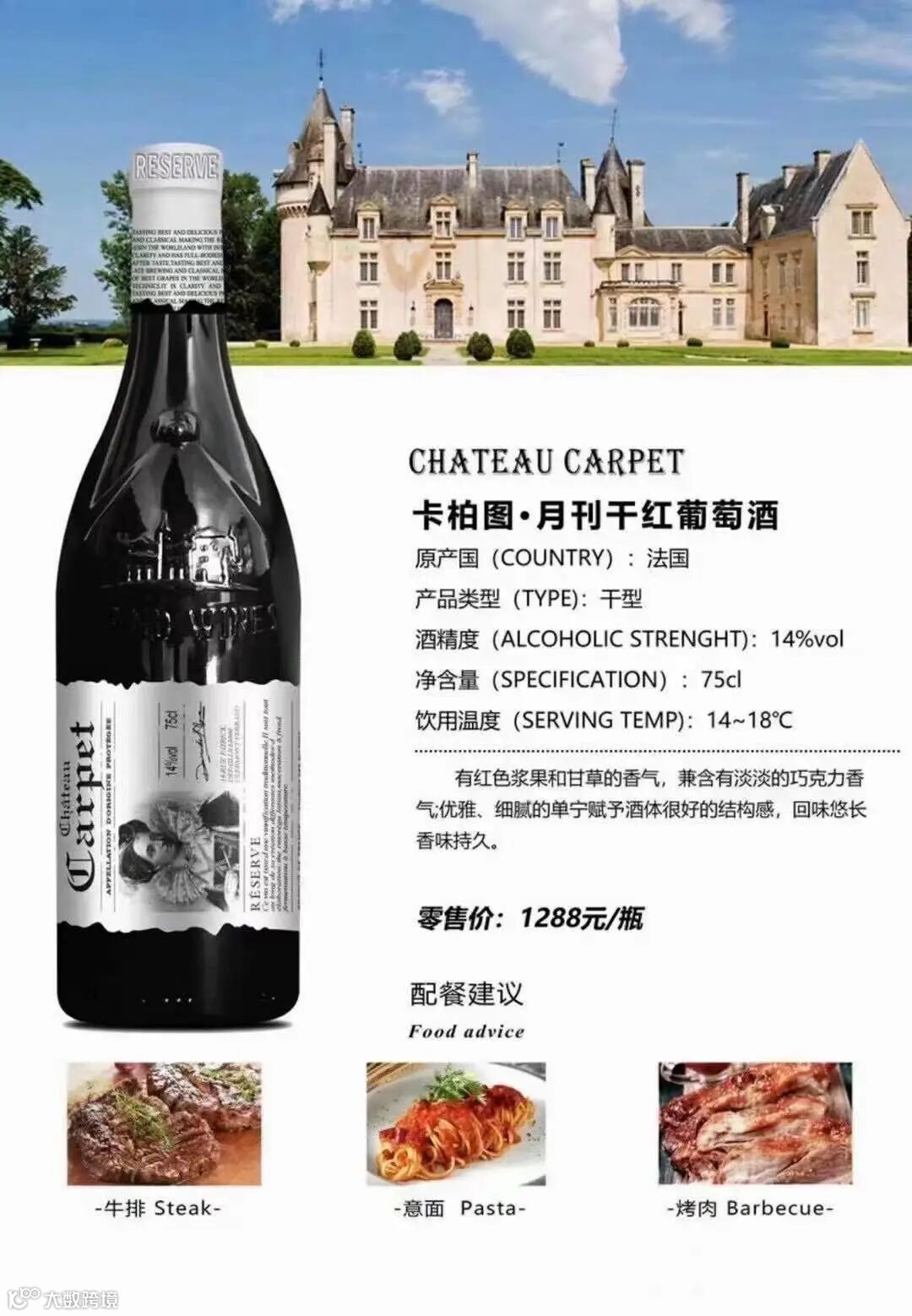 “法国经典AOP级别,单宁丰满,果香浓郁,一定是你想要的。’