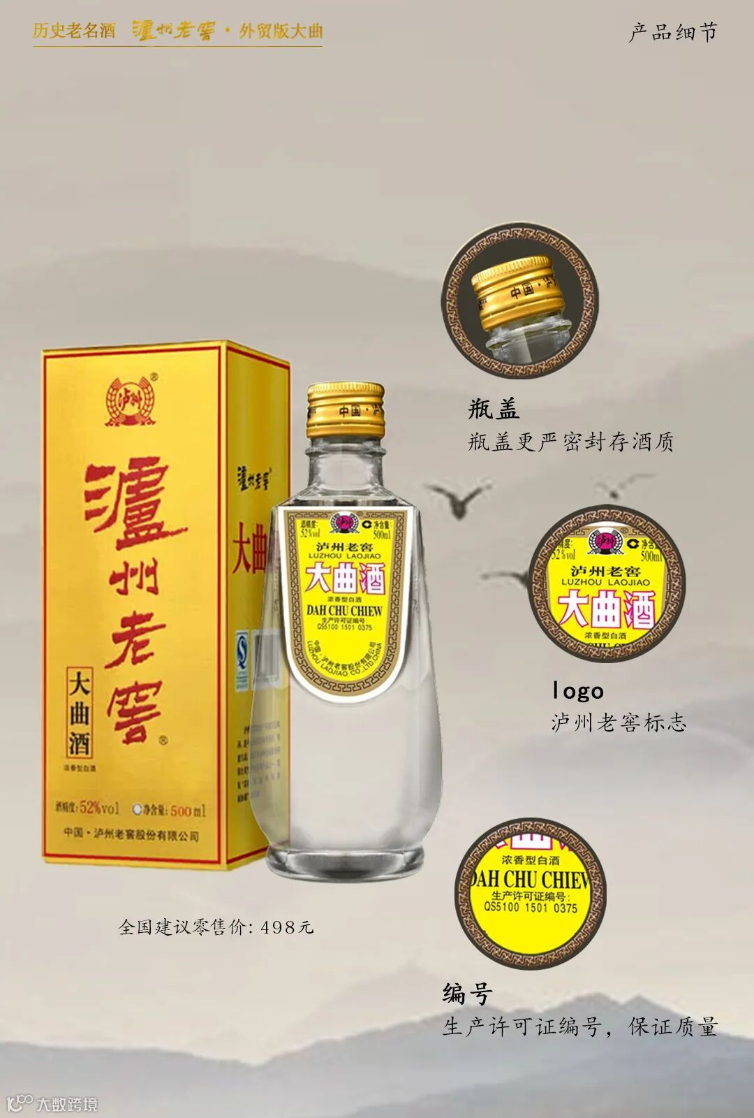 泸州老窖外贸版大曲盛装国宝窖池优质酒体以其卓越品质,在出口创汇上成绩斐然;以其专属性,珍贵性和可靠性,堪称中国名酒经典,以昂扬的姿态将中国的“酒文化”带入国际,向世界展示“中国名酒”的力量。