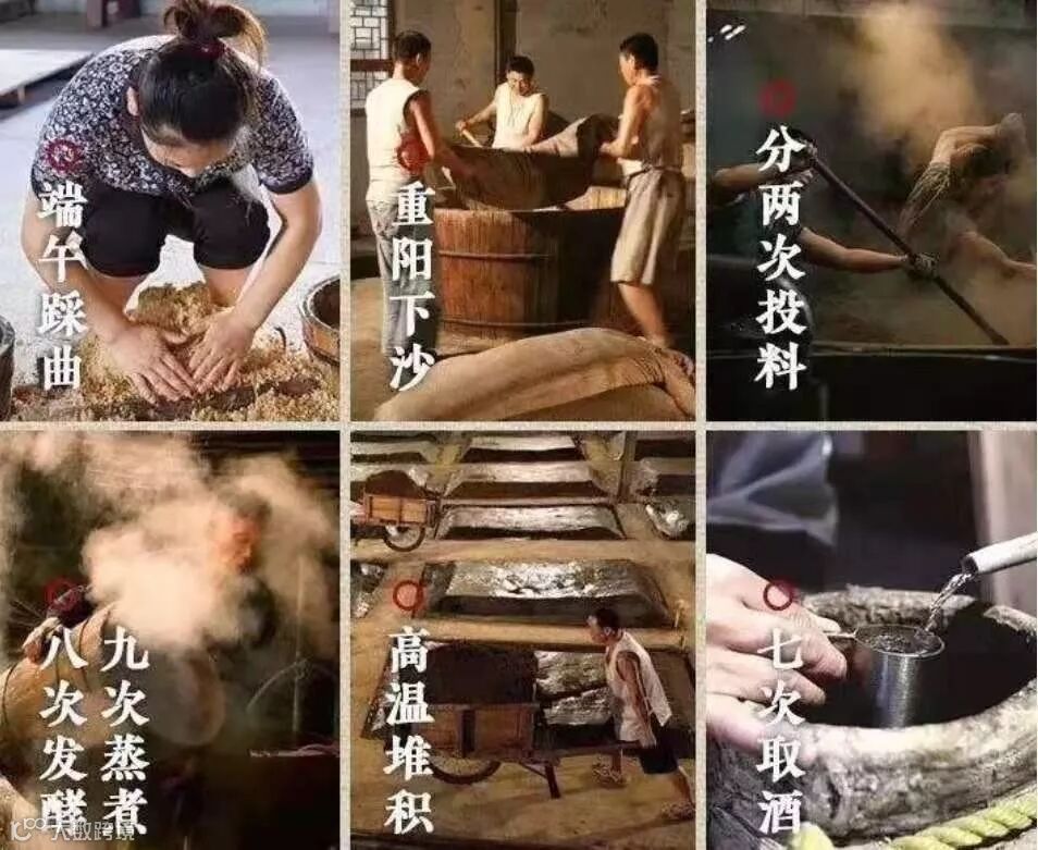 清蒸下沙1次,混蒸造沙1次,熟糟→上甑蒸酒6个轮次循环过程中有6次封窖发酵,每加曲入窖发酵1个月,共8次发酵;