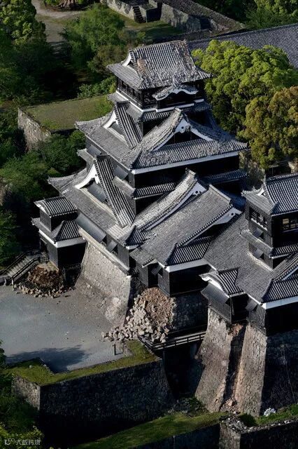 2016年4月14日晚日本九州岛熊本县遭遇强烈地震,灾难过后,熊本城受损严重,逾400年历史的古城主建筑墙壁破裂,天守阁屋顶瓦片崩落,其中石墙约100米崩塌。