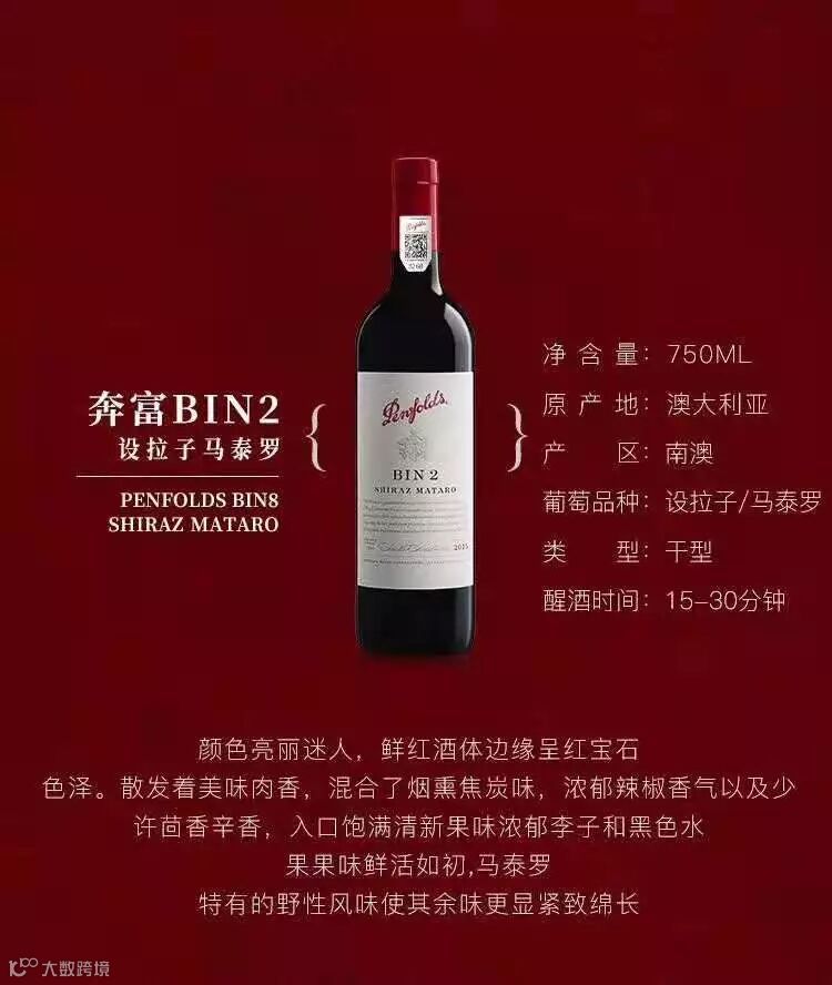 水果特点、饱满、馥郁、浓烈、坚实的单宁骨架,是bin2葡萄酒的标志。