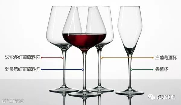 波尔多葡萄酒杯:杯身较长,杯口较窄,此杯形可令酒的气味聚集于杯口。除了勃艮第红葡萄酒以外,波尔多葡萄酒杯也适用于其它很多红葡萄酒,因为大部分的葡萄酒都是根据波尔多的风格去制作的。