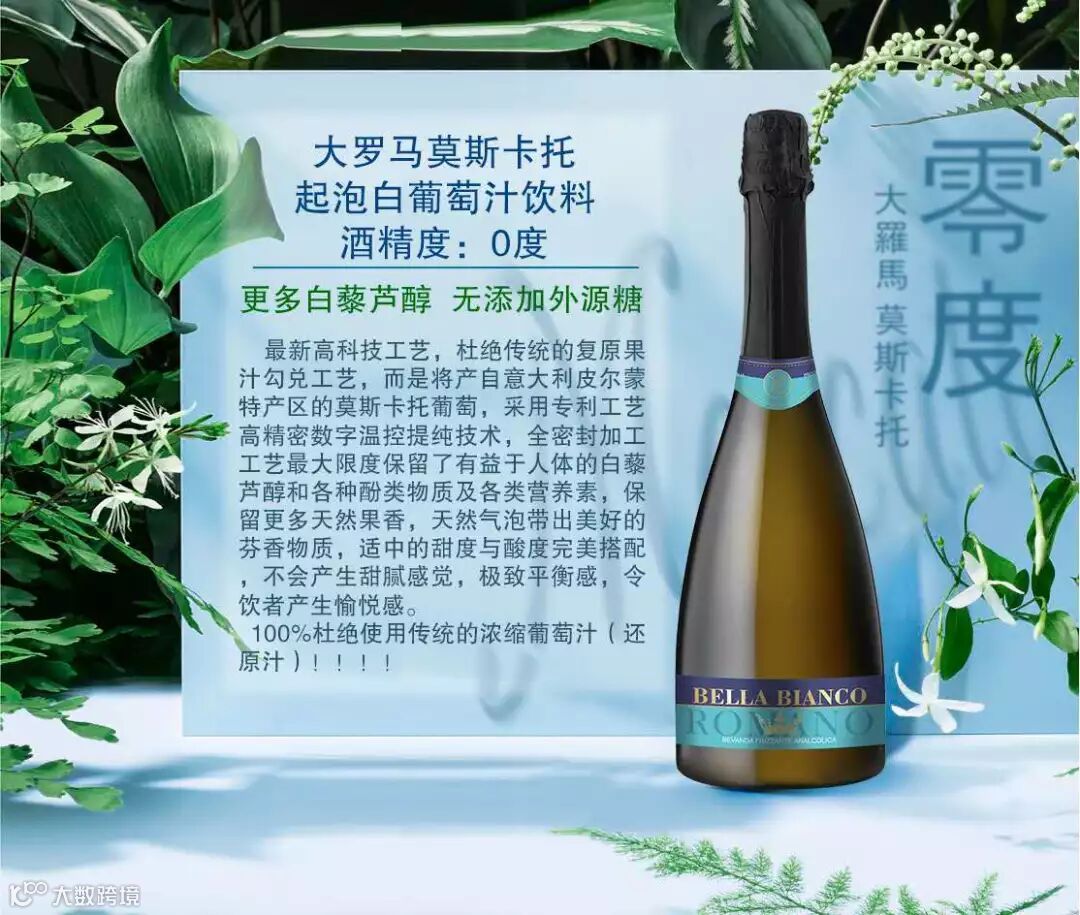 大罗马莫斯卡托白葡萄汁凭借0酒精、半起泡、甜度低,带有莫斯卡托葡萄品种典型的浓郁花香等特点受到广大消费者的喜爱。莫斯卡托一名源自意大利,是世界上最古老的栽培品种之一。