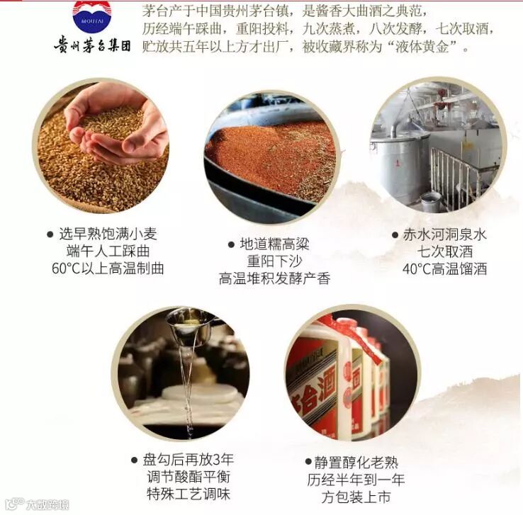 ☞三是制曲温度高达60℃以上,俗称高温大曲,每块曲砖需经过长达40天的发酵及6个月以上贮存方能使用,这种古老的发酵方法为茅台酒带来了丰满醇厚的香气成分,在世界蒸馏酒中独一无二。
