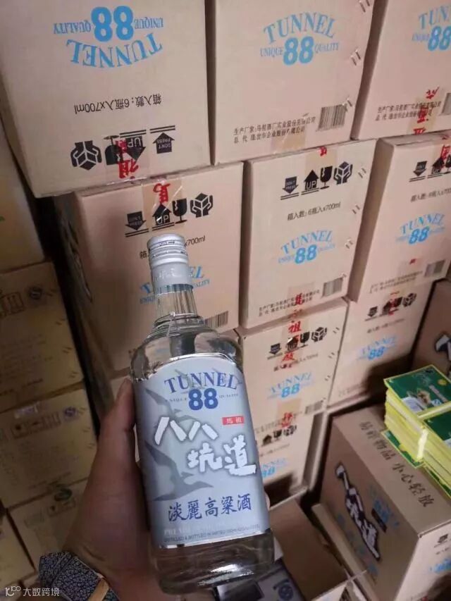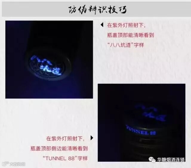 在紫外灯照射下,瓶盖顶部能清晰看到“八八坑道”字样以及“TUNNEL 88“字样。