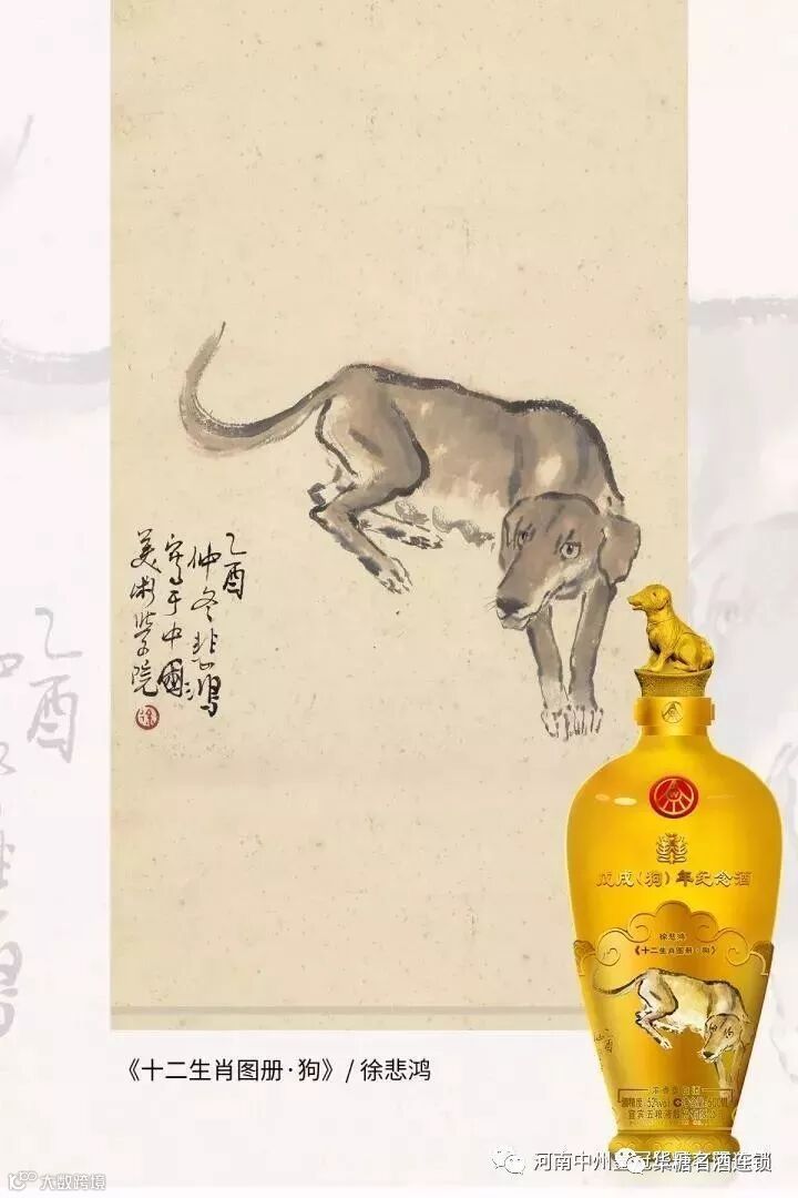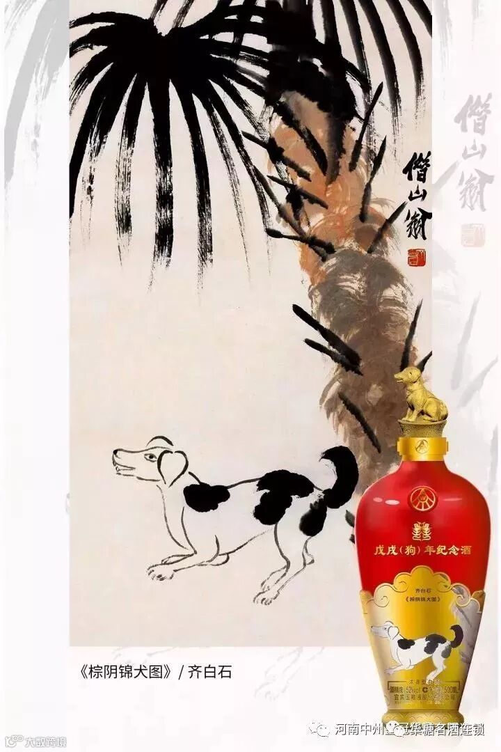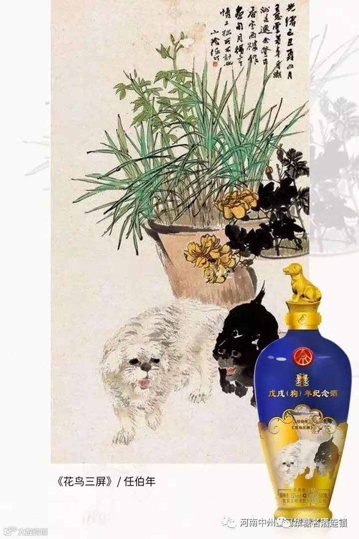匠心独运,戊戌(狗)年纪念酒瓶身绘图精心选制。分别为:郎世宁《十犬图·苍水虬》、徐悲鸿《十二生肖图册·狗》、齐白石《棕阴锦犬图》、任伯年《花鸟三屏》。色彩上采用对比手法,调色单纯、艳丽,强烈明快,构成红火,热烈的艺术效果。【戊戌狗年纪念酒】瓶身选用古今四位国画大师之作 ,传统之美,寓意深远。