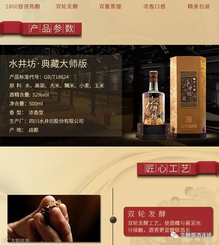 水井坊 典藏大师版,传承历代水井坊酿酒大师对品质不断追求的执着精神,以双轮发酵、双重蒸馏之加倍考究工艺,经一千八百余昼夜天然熟成,终造就典藏大师版“陈香优雅,醇厚丰满”之独特口感,堪为浓香典范。