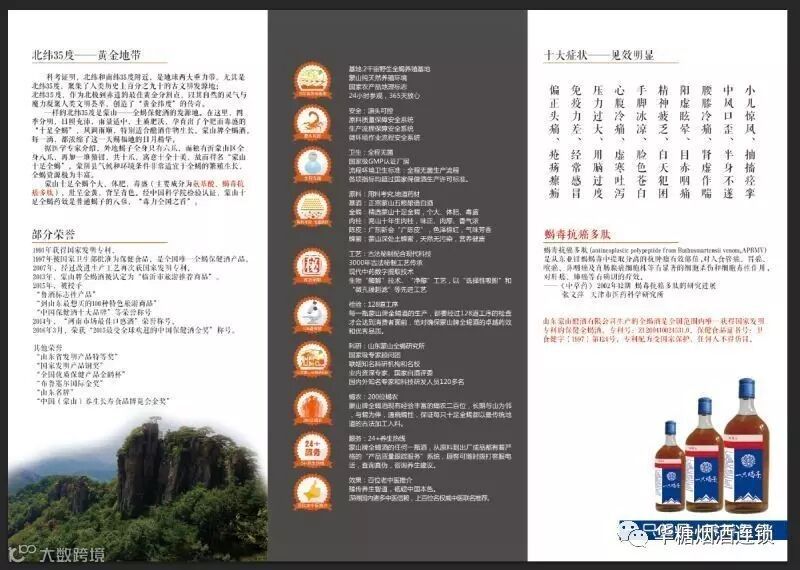 一样的北纬35度是蒙山、全蝎保健酒的发源地。在这里,四季分明,日照充足,雨量适中,土质肥沃,孕育出了个肥的“十足全蝎”。