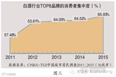 而在过去一年中,品牌集中度的上升速度又有所加快,截至2015年4月,白酒品牌TOP8能够覆盖到的消费者比例达到65.92%,相比2014年上升了1.41个百分点。