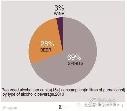 所谓烈性酒即指蒸馏酒,分为中国白酒、白兰地、威士忌、伏特加、金酒、朗姆酒、龙舌兰酒七类。世界卫生组织2010年《全球酒精与健康状况报告》显示,中国的酒类消费中,烈性酒类占酒精消费的69%,啤酒类占28%,红酒类3%(图一)。