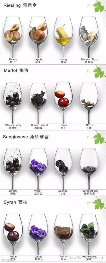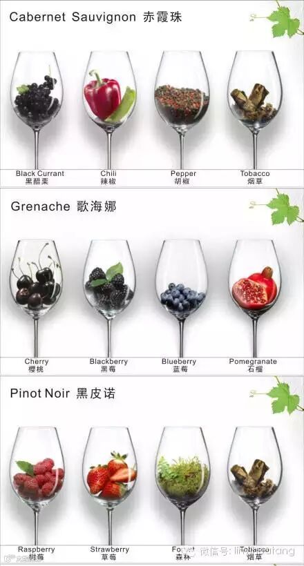 例如:西拉(Syrah)酒中胡椒的香气(Pepper);琼瑶浆(Gewurztraminer)酒中荔枝(Lychee)的香气;赤霞珠(Cabernet Sauvignon)酒中黑醋栗(Blackcurrant)的香气;黑皮诺(Pinot Noir)酒中樱桃(Cherry)的香气;维欧尼(Viogner)酒中杏(Apricot)的香气;长相思(Sauvignon Blanc)酒中黑醋栗芽苞(Blackcurrant Bud)的香气等等。