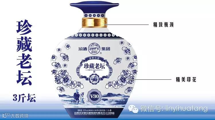 汾酒老坛V30,52度三斤装。采用30年存优质老酒调制而成,瓶身满花,杏花图案,下端配有牧童诗人问路精彩故事,采用水墨山水画风格,国粹、国画、国酒浑然一体自然天成,再现汾酒千年文化及人与自然和谐的养生之道。蓝色大盖、金色瓶颈、青花瓷身似一曲天成,延续国酒风格,传承清香文化,是收藏送友之尚品。