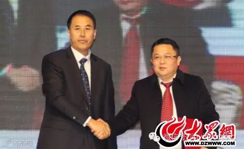 温和酒业董事长韩东(右)与临沂工商联糖酒食品商会主体经销商、温河王1号经销商正式签订10亿元的商务合作项目