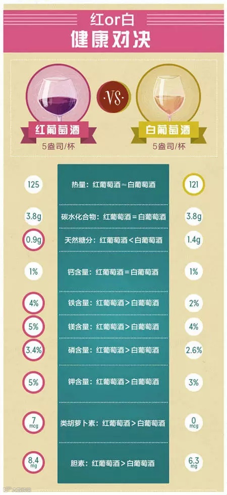 红葡萄酒含有更多的矿物质、更低的糖分,因此其也更加有益于健康。其实这还没有把红葡萄酒的抗氧化性计算在内。据最近的一项研究表明,红葡萄酒含有更多的抗癌物质—-白藜芦醇,以及对心肺功能有益的多元酚。因此,可以说红葡萄酒的功效可能远远不止图中所列数据。