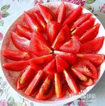 糖拌番茄,取两个番茄放进开水中烫过去皮,切成小片,洒上白糖腌一下即可