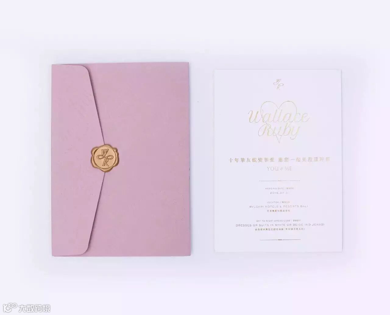 首先,就要说说请帖了。请帖颜色选用林心如一直喜欢的梦幻粉色,棕榈叶凹凸感暗示海岛元素,寓意婚礼在巴厘岛举行。喜帖风格相当高雅简洁,除婚礼信息,只有一句话“ 十年挚友蜕变挚爱,邀您一起见证这时刻,You &Me"。(说到这里,想提醒一下有十年朋友关系的单身男女,是不是也约个会,表个白什么的......^_^^_^^_^)