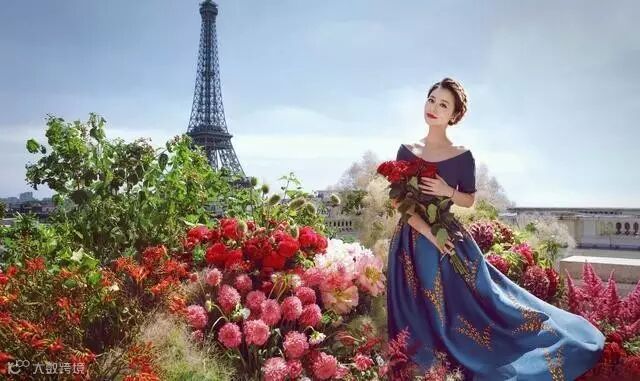 大片中林心如红唇盘发在埃菲尔铁塔前大秀女王范儿,复古孔雀蓝长裙和法国的浪漫气息超配哟~