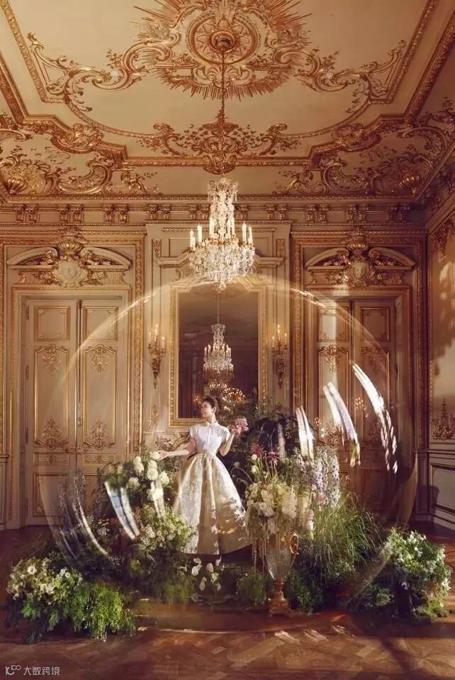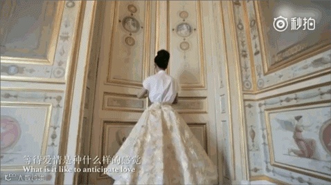 换上白裙的林心如像个公主,站在有水晶球和花朵的宫殿里,等待王子来见她~