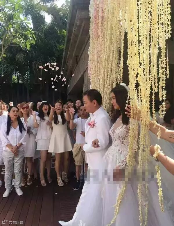 新娘林心如就在这一片花影摇曳中身穿Zuhair Murad 2016秋冬系列婚纱和爸爸牵手走出,超长后摆的白色婚纱+妩媚卷发将格格衬托得愈发楚楚动人