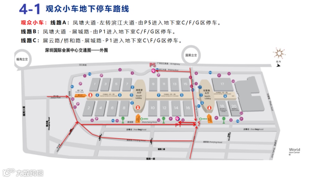 可将目的地设置为“深圳国际会展中心P1/P5停车场”,请将车辆停放在C/F/G区,参观更快捷!