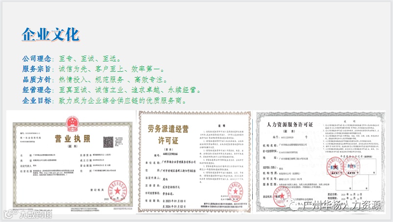 广州华杨企业管理服务有限公司是经黄埔区市场监督管理局工商局注册成立从事企业综合供应管理服务的专业公司,其主营业务范围是为各类企业提供企业信息咨询、人才招聘、信息发布、人力资源服务与管理、劳务承揽、劳务派遣、小时工外包、人力资源外包服务、业务流程外包、包装服务、单位后勤管理服务。