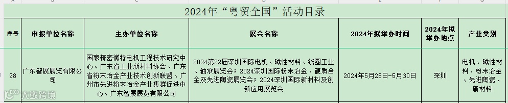 由广东智展展览有限公司联合众多协会商会举办的第二十二届深圳国际小电机及电机工业、磁性材料展览会;2024深圳国际线圈工业、电子变压器及绕线设备展览会;2024深圳国际轴承及制造技术展览会;2024深圳国际粉末冶金、硬质合金及先进陶瓷展览会;2024深圳国际新材料及创新应用展览会已入选 2024年“粤贸全国”活动目录。