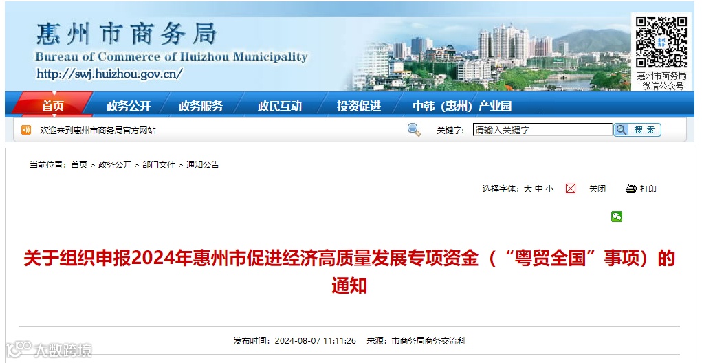 为支持惠州市企业参与国内国际双循环,拓展国内国际市场,加快内外贸一体化发展,做好贸易高质量发展十大工程中“粤贸全国”品牌工程,8月7日,惠州市商务局官网发布《关于组织申报2024年惠州市促进经济高质量发展专项资金(“粤贸全国”事项)的通知》,现将对参加“粤贸全国”活动目录内主题活动且符合相关申报条件的惠州市企业,给与相关专项资金支持,对其参展展位费、特装费实际支出给予最高80%补贴!