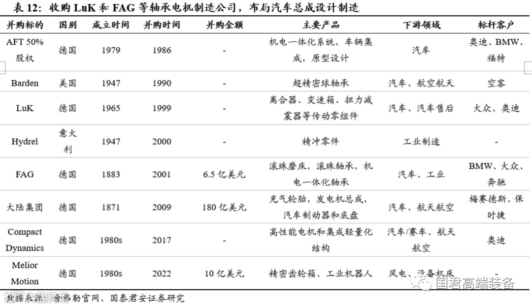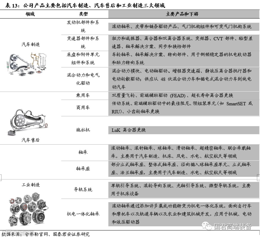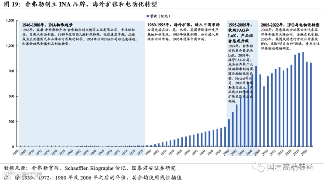 1980年-2000年,公司逐步完成AFT、LuK等汽车零部件制造公司收购,从单一轴承制造向汽车总成制造领域拓展,打开成长天花板。2017年至今,该公司生产高性能轻量化电机,向新能源汽车领域转型升级。