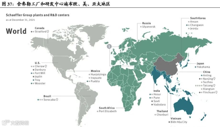 舍弗勒工厂和研发中心遍布欧、美、亚太地区。公司在全球超过50个国家有20个研发中心、150个工厂和15个双元制培训中心。其中,欧洲地区是最大生产基地,总部位于德国纽伦堡,有43个工厂和10个研发中心、53,006名员工。