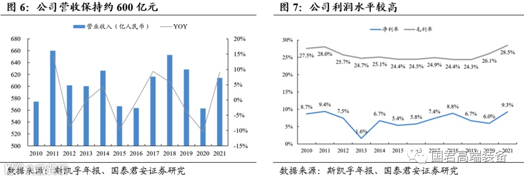 斯凯孚营业收入保持约600亿元,2021年公司利润快速恢复。毛利率保持在25%-30%间,净利率保持在6%以上,盈利能力较强。