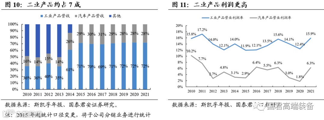 公司以生产销售工业产品为主,工业产品盈利更高。公司主要业务分为工业产品与汽车产品,工业产品销售额约占70%,给公司带来了85%以上的营业利润,有着比汽车产品更高的利润率。工业产品营业利润率约为15%,汽车产品营业利润率约为6%。
