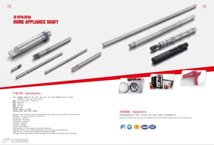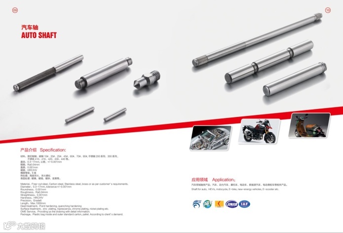 本厂专业生产高精度电机轴、扫描仪轴、齿轮轴、振动马达轴等各种精密轴件。我们根据图纸或样品专业定制加工。常用的材料碳钢45号、60号、70号、80号;不锈钢303、304、316、不锈铁420等。直径范围在0.3-20mm,长度范围在600mm以内。