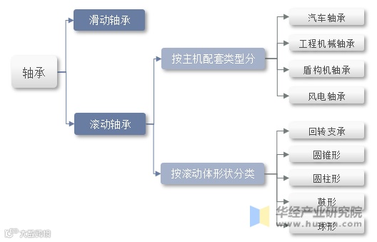轴承是机械设备中的一种基础部件,主要功能是支撑机械旋转体、降低机械旋转体运行过程中的摩擦系数、保证机械旋转体的回转精度,被誉为“工业关节”。轴承产品规格型号较多,按主机配套类型分可分为风电轴承、工程机械轴承、汽车轴承、机床轴承、铁路轴承、冶金矿山机械轴承等;根据轴承工作时承受的载荷方向,分为主要承受径向载荷的向心轴承和主要承受轴向载荷的推力轴承;根据轴承工作时运转的轴与轴承座之间的摩擦性质,可分为滑动轴承和滚动轴承两大类,其中滚动轴承是轴承工业的主要产品,通常所说的轴承,一般指滚动轴承。