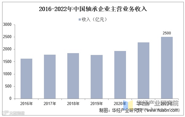 我国作为轴承生产大国已经形成了独立完整的工业体系,目前处于产业结构升级的关键时期。实施工业强基工程,发展工业生产新模式、新业态,实现新旧动能的转换是我国轴承行业目前的主要任务。根据中国轴承工业协会估算,我国轴承行业2022年完成营业收入2500亿元,相比2021年的2278亿元增长9.7%。
