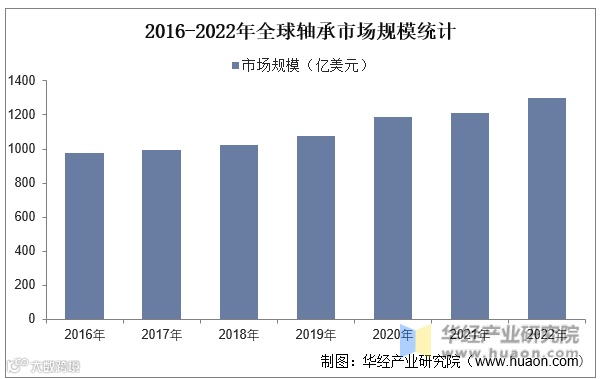 随着能源、交通运输、冶金、化工等行业机械装备朝着大型、重载、高速的方向不断发展,下游行业对滑动轴承的需求量不断提高。根据市场研究机构公布的报告显示,2021年全球轴承市场规模已经达到1213亿美元,2022年为1302亿美元。