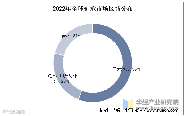 2022年亚太地区轴承市场规模约占全球轴承市场的56%,其中我国的市场规模约占全球轴承市场的34%,带动了整个亚太地区市场规模的高速发展。欧洲、中东及非洲占比23%,美洲占比21%。