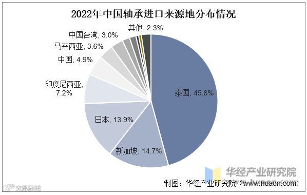 我国轴承主要进口来源地为泰国,2022年进口数量达9.58亿套,占比45.8%。