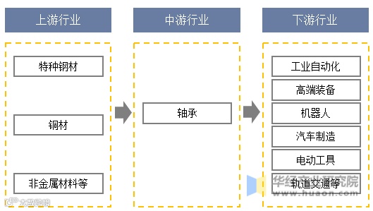 轴承行业上游企业主要包括特种钢材、铜材、非金属材料等供应商,下游广泛应用于工业自动化、高端装备、机器人、汽车制造、工程机械、家用电器、电动工具、纺机、农林机械、国防、能源、航空航天及轨道交通等领域。