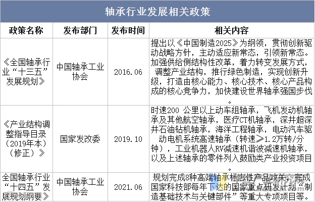 国家相关政策助力汽车行业发展,为轴承行业的发展提供了良好的宏观环境。2019年,发展改革委修订发布《产业结构调整指导目录(2019年本)》将18种轴承列为鼓励类产品,也是《中国制造2025》的核心基础零部件。2021年,中国轴承工业协会发布《全国轴承行业“十四五”发展规划纲要》,提出推动我国轴承产业由全球轴承产业链的中低端迈向中高端,提高国产轴承的技术水平和质量水平,满足主机配套需求并替代进口。相关行业政策及产业政策的引导作用将推动行业的技术进步,促进行业提高自主创新能力,加快产业结构优化升级。