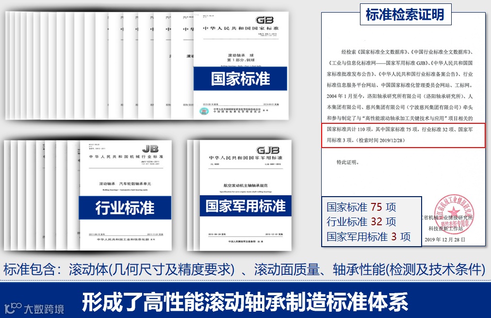 成果攻克了高性能轴承核心元件高一致性和高表面质量加工世界难题,大幅提升了轴承品质。团队及合作单位参与起草国家、行业及军用轴承标准110项。研制的航天高性能轴承打破了国外封锁,在卫星、天宫、神舟等成功应用,市场占有率 90%以上。大规模产业化的民用精密低噪音轴承国内市场占有率达 60%,并出口到欧美国家。产生了重大的社会经济效益,显著推动了轴承行业的科技进步。
