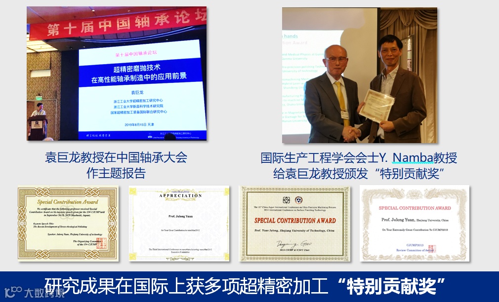 袁巨龙教授领衔的研究团队在国家自然科学基金重点项目、国家科技重大专项等支持下,针对高端滚动轴承制造难题,历经十余年产学研用协同创新研发,在高精度滚动体高一致性加工方法、滚动面高表面质量抛光技术、轴承加工装备方面取得了重大创新与突破,实现了高性能滚动轴承制造产业化。
