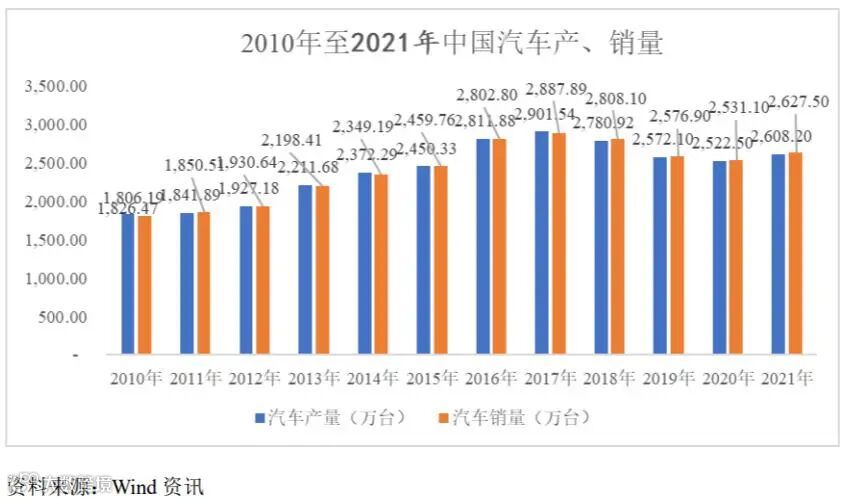 2021 年,我国汽车产销量已经分别达到 2,608.20 万台和 2,627.50 万台,已经成为全球汽车的生产、消费大国,产销量全球领先。如下图所示,2010 年以来,我国汽车产销量稳中有增,虽然有个别年份出现下滑的情形,但依然维持了较高的产销规模。预计我国未来能够保持汽车消费大国的地位,汽车行业前景良好。