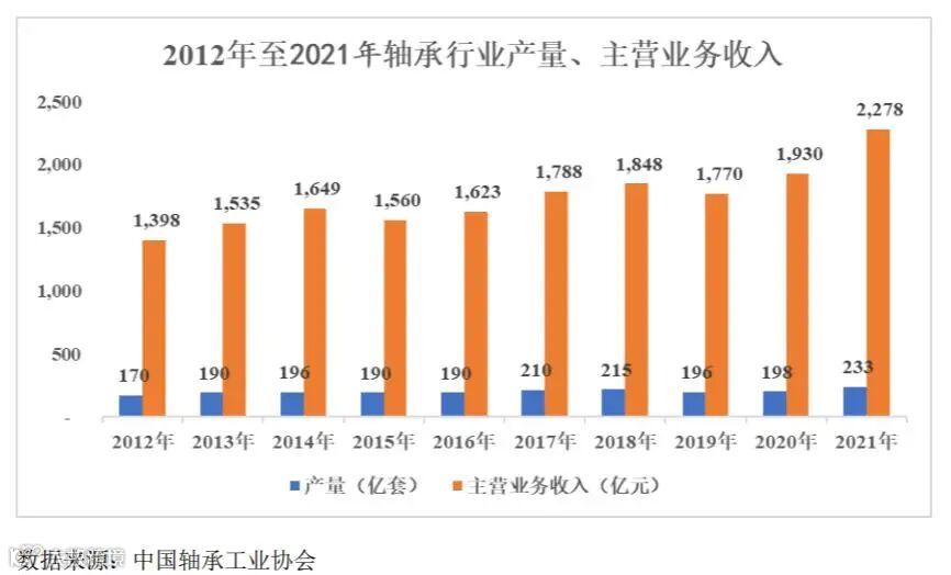 我国已经形成了独立、完整的轴承工业体系。随着多年来的持续、快速的发展,我国轴承产业已经形成了独立、完整的工业体系,中国轴承行业消费量已经位居世界第一。根据 2020 年统计,全行业规模以上企业 1,300 余家,从业人员近 40 万人,轴承产量 198 亿套,至 2021 年,轴承产量增长至 233 亿套。