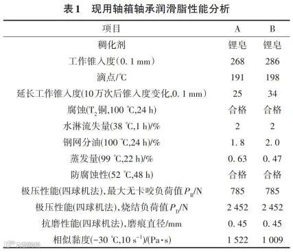 我国动车组轴箱轴承常用润滑脂主要有两种,润滑脂的基本性能见表1。A、B两种润滑脂采用的基础油黏度不同,稠化剂均为锂皂,成品脂均为2号[锥入度265~295(0. 1 mm)]润滑脂,高温性、防腐蚀、极压抗磨及机械安定性等性能相当,B润滑脂的低温性能优于A润滑脂。