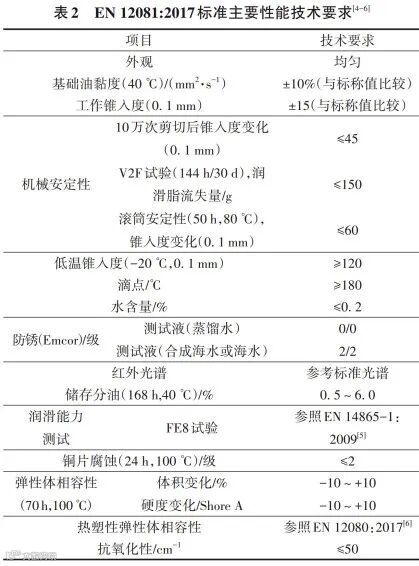 欧洲标准委员会根据铁路轴箱润滑脂运用经验,结合大量试验和实践经验,制定了EN 12081:2017铁路轴箱轴承润滑脂技术标准,该标准规定了轴箱轴承润滑脂技术要求、认可步骤、质量控制和检测方法等内容。该标准是目前国内外认可度较高、应用较广泛的轴箱轴承润滑脂技术标准,EN 12081:2017标准主要性能技术要求见表2。
